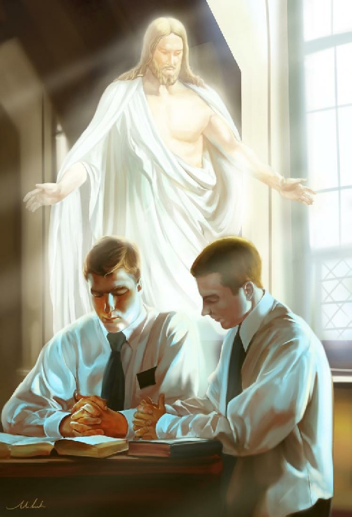 A: The composition presents a particularly intimate view of the Redeemer. When He first spoke to the peoples of ancient America, as part of His personal ministry among them, they had suffered cataclysm for three days. Their distress was dreadful. They were as yet engulfed in the close and complete darkness that had not only settled over the land, but was so dense that no fire could be kindled nor any light seen.